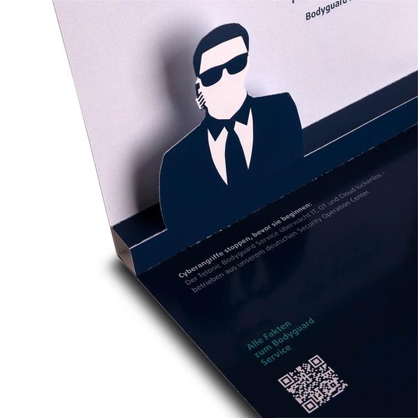 Die 3D Popup-Karte Bodyguard im Format DIN A6 ist eine aufmerksamkeitsstarke Effektkarte mit einseitig kratzfester Matt-Cellophanierung, die eine edle Haptik und hohe Wertigkeit vermittelt. Beim Öffnen richtet sich im Inneren eine stilisierte Agentenfigur als filigranes Pop-up-Motiv auf und macht den Gedanken von Schutz und Sicherheit sofort sichtbar. Die Vorderseite ist im Corporate Design mit Logo gestaltet und transportiert die Botschaft klar und prägnant. Wir von Kreatives Drucken unterstützen die Telonic GmbH dabei, ihren exklusiven VIP-IT-Schutz in der Technologiebranche wirkungsvoll zu präsentieren und Aufmerksamkeit zu erzeugen. Die Karte dient dazu, Vertrauen aufzubauen, technische Kompetenz greifbar zu machen und den Markenkern von Telonic – Sicherheit, Wachsamkeit und Zuverlässigkeit – nachhaltig im Gedächtnis der Empfänger zu verankern.