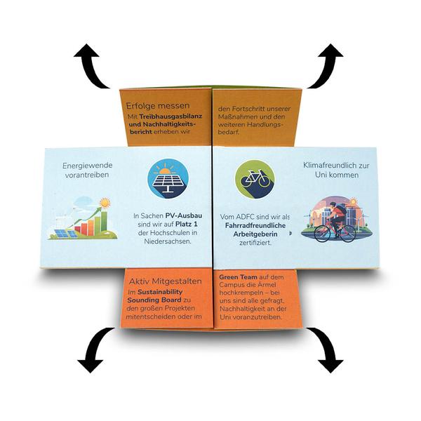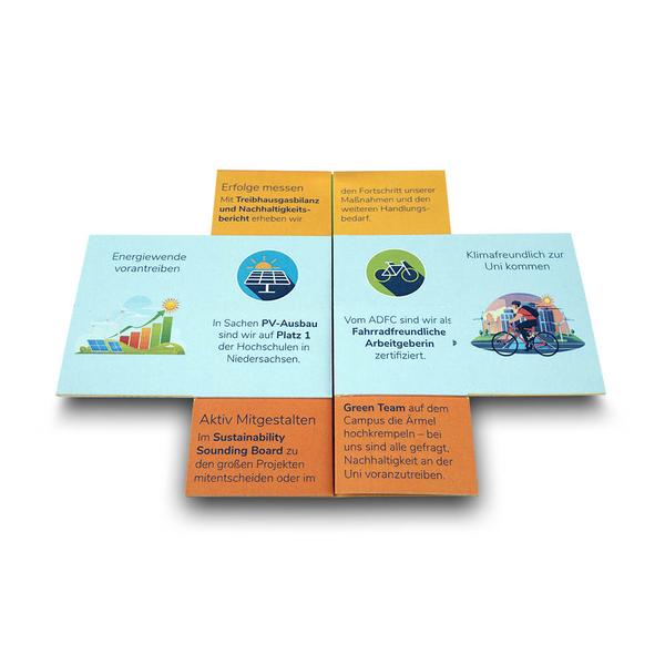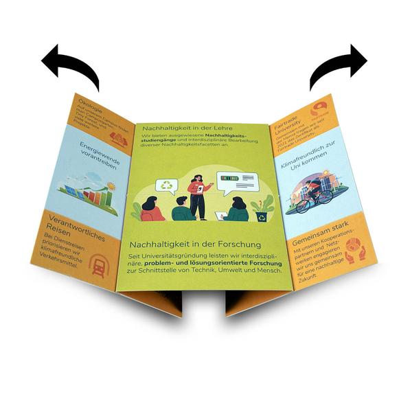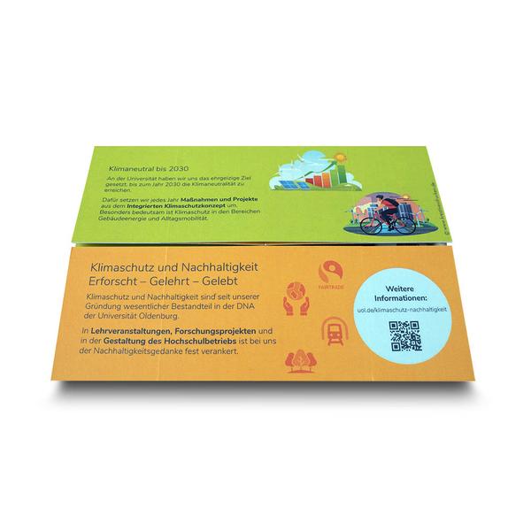 Die Endloskarte Klimaschutz Uni Oldenburg ist ein interaktives Magic-Flyer-Werbemittel mit raffinierter Faltmechanik und einseitiger matter Cellophanierung. Die in der Mitte perforierte Titelseite ermöglicht ein direktes Öffnen, danach werden Seitenflügel und Mittelteile Schritt für Schritt umgefaltet, sodass bei jeder Bewegung neue Ansichten entstehen. Auf allen Flächen vermitteln klar strukturierte Infotexte, Schaubilder und Motive Wissen rund um Nachhaltigkeit und Klimaschutz mit direktem Bezug zur Universität, ergänzt durch Logo und individuelles Design. Wir von Kreatives Drucken unterstützen die Carl von Ossietzky Universität Oldenburg dabei, ihre wissenschaftliche Kompetenz und ihr Engagement im Bildungssektor anschaulich und verständlich zu präsentieren. Die Endloskarte weckt Neugier, bleibt durch die interaktive Nutzung im Gedächtnis und macht Marken-Botschaften hochwertig erlebbar – auf Wunsch auch mit direkter Personalisierung.
