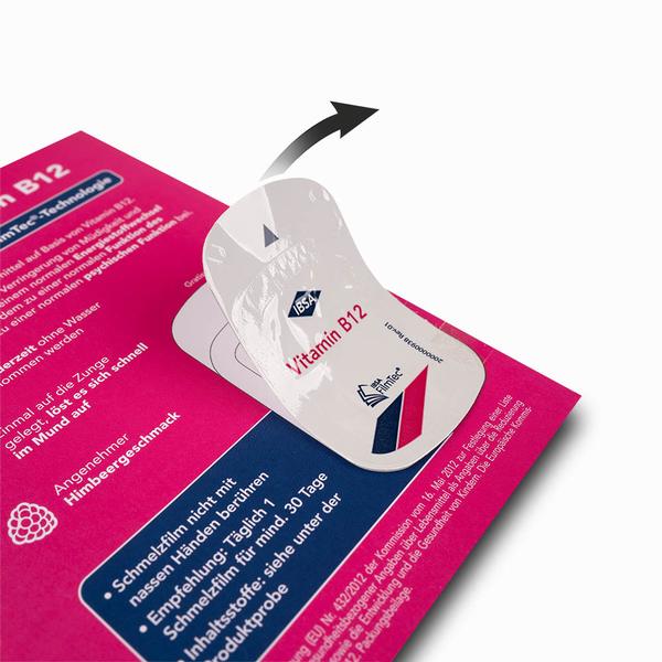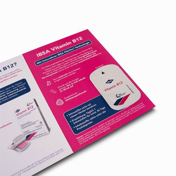 Der Produktproben Flyer ist eine präzise umgesetzte Werbedrucksache, bei der ein individuell bedruckter und genuteter DIN A6 Flyer mit einer originalen Produktprobe kombiniert wird. Die Vitamin B12-Probe wird mithilfe transparenter Silikonklebepunkte exakt an der vorgesehenen Stelle fixiert und sorgt so für eine saubere, sichere und hochwertige Präsentation. Ergänzend informieren bedruckte Innenseiten übersichtlich über Wirkung und Anwendung der Vitamin B12-Tabletten und vermitteln den gewünschten Energie-Kick direkt am Point of Sale. Wir von Kreatives Drucken unterstützen IBSA Derma dabei, ihre Gesundheitsprodukte in der Pharma- und Kosmetikbranche aufmerksamkeitsstark zu präsentieren und durch das direkte Testangebot Kaufimpulse auszulösen. Die zu je 20 Stück banderolierten Flyer verbinden Information, Produkt und Logistik zu einem kompakten Werbemittel, mit dem Markenbotschaften hochwertig erlebbar gemacht werden.