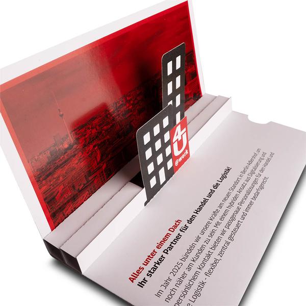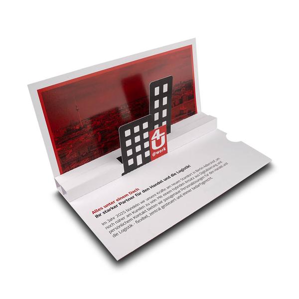 Die 3D Pop-up Karte Personallösungen ist ein kreatives Produkt für Unternehmen wie 4u work. Diese Werbekarte ist ideal zur Kundengewinnung. Beim Aufklappen erscheinen zwei ausgestanzte Hochhäuser vor der Skyline Berlins als 3D-Motiv auf zwei Ebenen. Eine passende Einschubkarte ist inklusive und eine Hülle ist optional möglich. Die Karte eignet sich hervorragend für die Darstellung von Angeboten und Partnerschaften. Wir als Druckerei sind Experten für Effektkarten, individuelle Drucksachen und Verpackungsdruck. Wir wissen, wie man Markenbotschaften effektiv erlebbar macht. Mit dieser hochwertigen Pop-up Karte helfen wir 4u work, sich von der Konkurrenz abzuheben und die Kundenbindung im Personaldienstleistungsbereich zu stärken.