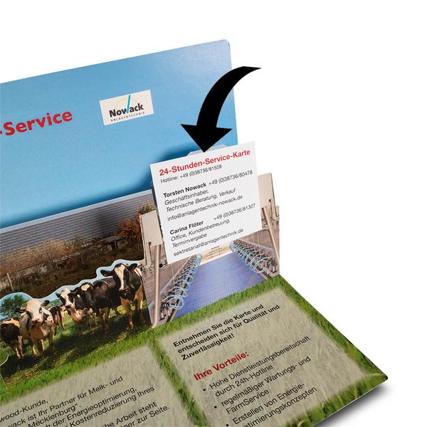 Die 3D Popup-Karte mit Telefonkarte Anlagentechnik wird auf 250g White Design gefertigt und entfaltet beim Öffnen eine mehrstufige, figürlich ausgestanzte Szene auf zwei Ebenen. Gedruckter Hintergrund und präzise Konturstanzungen erzeugen einen räumlichen Effekt, der Gebäude, Landschaft und Motive lebendig wirken lässt. In das zweite Pop-up ist ein Schlitz für eine Telefonkarte im Format 55 x 85 mm integriert, die vom Kunden selbst bestückt wird und zusätzliche Kontaktdaten oder Servicehinweise transportiert. So verbinden sich Emotion, Information und Funktion in einem aufmerksamkeitsstarken Printprodukt. Anlagentechnik Novak nutzt diese besondere Karte, um technische Kompetenz und Serviceleistungen eindrucksvoll zu präsentieren und im direkten Kundenkontakt nachhaltig in Erinnerung zu bleiben. Die Kombination aus 3D-Effekt und Einsteckkarte macht Angebote greifbar und persönlich. Als Hersteller unterstützen wir dabei, solche individuellen Lösungen präzise umzusetzen und die Markenbotschaft wirkungsvoll in Szene zu setzen.