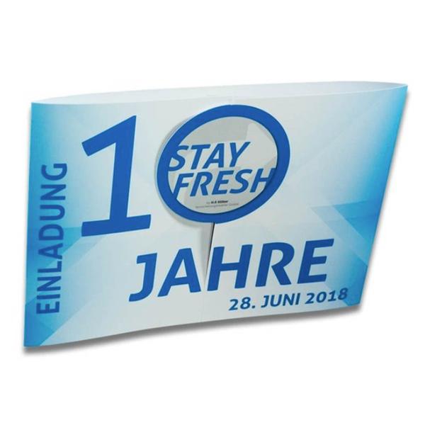 Die Altarfalzkarte Querformat mit Ausstanzung ist ein kreatives und vielseitiges Produkt für Unternehmen wie Stay Fresh. Diese Klappkarte mit Altarfalz eignet sich ideal als Einladungskarte zu einer Jubiläumsveranstaltung und hat einen hohen Aufforderungscharakter. Eine individuelle Stanzung macht den Titel zusätzlich interessant. Im aufgeklappten Zustand bietet die Karte links und rechts zusätzliche Flächen für Ihr Layout. Die Stanzung und das Format können individuell angepasst werden. Diese hochwertige Karte hilft Stay Fresh, ihre Markenbotschaft professionell und ansprechend zu kommunizieren. Ihre durchdachte Funktionalität und das ansprechende Design spiegeln den Qualitätsanspruch und die Seriosität des Unternehmens wider. Sie ermöglicht eine effiziente und repräsentative Übergabe von Informationen an Kunden und Partner und stärkt so die Kundenbindung im Marketing- und Kommunikationsbereich.