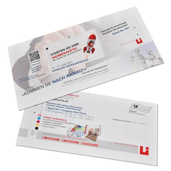 Lindner aus Mainz berät Sie umfassend. Das Mailing besteht aus 300g White Design, um die Visitenkartentasche (für Visitenkarten im Format 85 x 55mm) stabil und dennoch leicht faltbar zu machen.