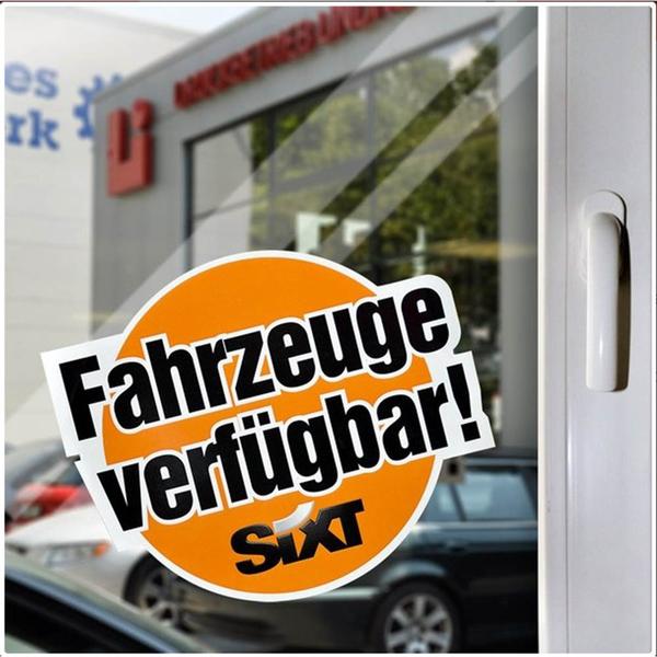 Es handelt sich bei diesem Material um eine spezielle Haftfolie ohne Kleber, die sich Adhäsions- oder Microsaugnapffolie nennt. Ähnlich wie bei einem Tintenfisch saugt sich die Folie an glatten Flächen fest. Neben der Tatsache, dass es keinerlei Kleberückstände gibt, weil kein Kleber verwendet wird, kann der Auto-Aufkleber schnell abgezogen und an anderer Stelle neu platziert werden.Diese formgestanzten individuell bedruckten Aufkleber für können bis zu einem Format von A1 hergestellt werden. Als geeignete Flächen sind neben Schaufenstern auch Wände von Messeständen, Autoscheiben, Türen oder Büroschränke denkbar. Besonders wirkungsvoll sind diese kreativen Aufkleber durch Formstanzungen, wie hier für Sixt Autovermietung, da diese noch besser ins Auge springen.