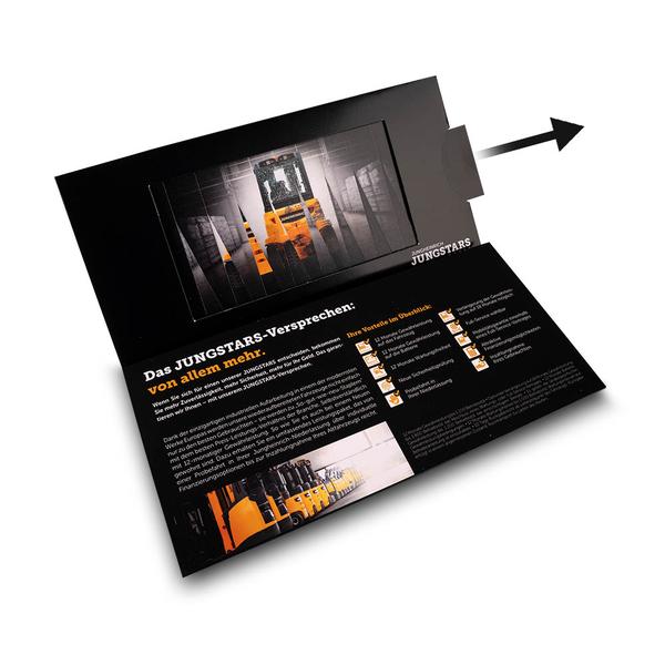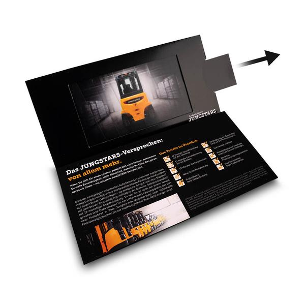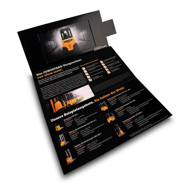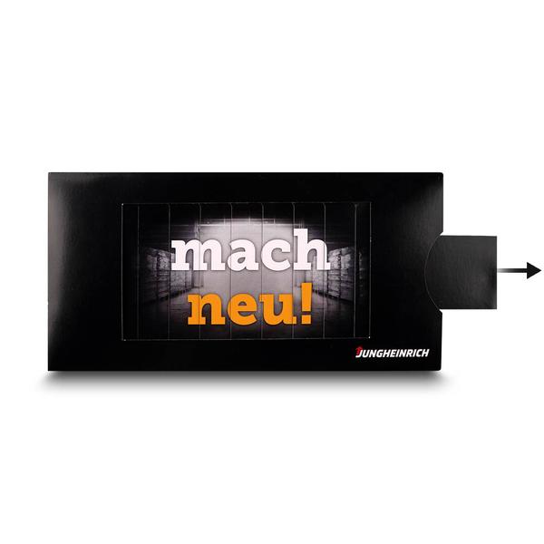 Die Doppellamellenkarte Jungheinrich 6-seitig ist ein kreatives und hochwirksames Produkt für die Jungheinrich AG. Diese Karte im DIN-lang-Format ist mit zwei Lamellenschiebefunktionen ausgestattet, was sie zu einer echten Doppel-Lamellenkarte macht. Durch Ziehen verändert sich das Motiv, wobei der Slogan von "aus alt" zu "mach neu" wechselt und so das Jungstars-Versprechen veranschaulicht. Eine zusätzliche Seite kann aufgeklappt werden, um beispielhafte Angebote mit verschiedenen Modellen übersichtlich darzustellen. Diese hochwertige Effektkarte hilft Jungheinrich, ihre Markenbotschaft professionell und interaktiv zu kommunizieren. Ihre durchdachte Funktionalität und das ansprechende Design spiegeln die Innovationskraft und den Qualitätsanspruch des Unternehmens wider. Sie ermöglicht eine überzeugende Präsentation von Produkten und stärkt so die Kundenbindung im Flurförderfahrzeuge-Bereich.