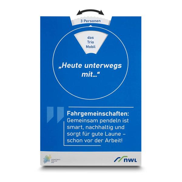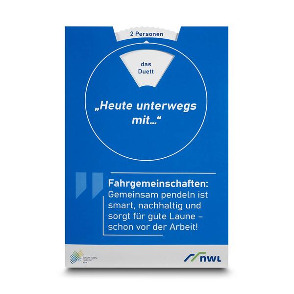 Die Drehscheibe Fahrgemeinschaften ist eine interaktive Werbekarte aus 300g White Design Karton mit einem Durchmesser von 21 cm. Ein drehbares Element macht unterschiedliche Fahrgemeinschafts-Optionen von zwei bis sechs Personen auf einen Blick sichtbar. Je nach Einstellung erscheinen Bezeichnungen wie „Duett“, „Trio“ oder „Partybus“, wodurch verschiedene Nutzungsszenarien anschaulich und spielerisch vermittelt werden. Der Mechanismus lädt zum Ausprobieren ein und steigert die Aufmerksamkeit. Individuelle Ausstanzungen sowie das integrierte Logo unterstreichen die hochwertige und aufmerksamkeitsstarke Gestaltung. Der NWL Nahverkehr Westfalen-Lippe nutzt die Drehscheibe, um nachhaltige Mobilitätskonzepte verständlich zu kommunizieren und Fahrgemeinschaften attraktiv darzustellen. So entsteht ein interaktives Printprodukt, das Informationen erlebbar macht und die Auseinandersetzung mit umweltfreundlichen Lösungen fördert.