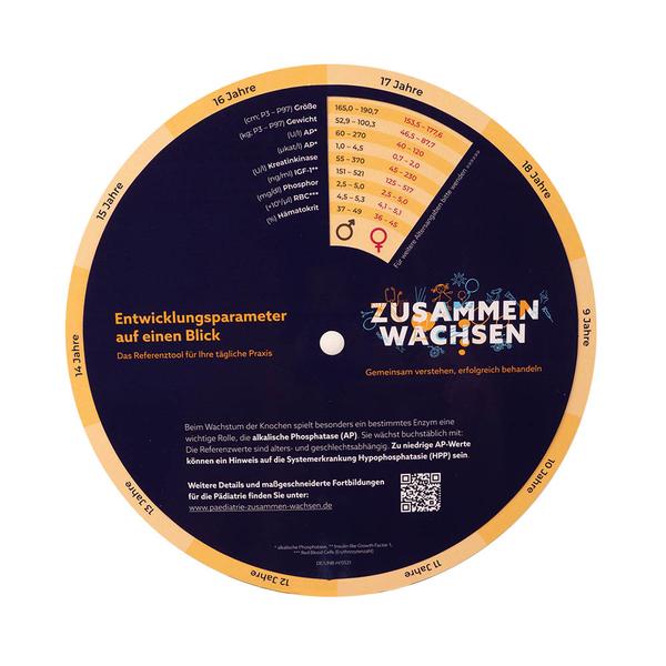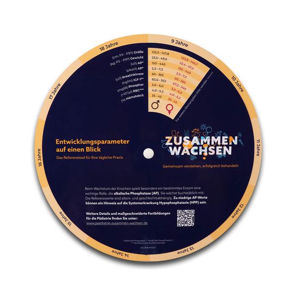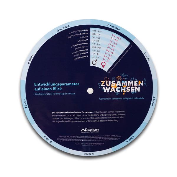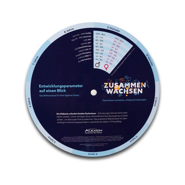 Die Drehscheibe ALEXION ist ein interaktives Informationsmittel mit 22,5 cm Durchmesser, das Entwicklungsparameter von Kindern übersichtlich auf einen Blick darstellt. Gedruckt auf 300g White Design mit beidseitiger Glanz-Cellophanierung und stabiler Kunststofföse lassen sich Werte zu Größe, Gewicht und Altersbereichen schnell einstellen und vergleichen. Die farblich unterschiedlichen Varianten decken Entwicklungsbereiche bis zum 8. bzw. 18. Lebensjahr ab und erleichtern die Orientierung im Alltag. Als Hersteller unterstützen wir Alexion aus dem medizinischen Umfeld dabei, Fachinformationen anschaulich zu vermitteln und einen klar verständlichen Beratungshelfer bereitzustellen.