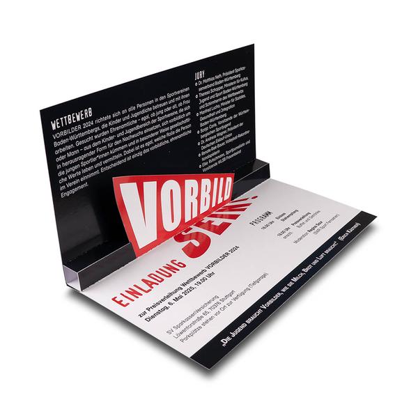 Die Einladungskarte "Pop-Up Sportjugend" ist eine dynamische und inspirierende Art, zu besonderen Ereignissen einzuladen. Für die Deutsche Sportjugend und insbesondere die Württembergische Sportjugend (WSJ) wurde diese Karte entwickelt, um zur Preisverleihung "Vorbild sein" einzuladen. Beim Öffnen der Karte popt der Schriftzug "Vorbild sein" dynamisch ausgestanzt in den Vordergrund und unterstreicht so die zentrale Botschaft von Engagement und Inspiration im Sport. Diese innovative Gestaltung fängt die Energie und den Geist der Sportjugend perfekt ein und sorgt für eine bleibende Erinnerung. Wir als Ihre Druckerei sind Spezialisten für Effektkarten und Spezialitätendruck und wissen, wie man Marken wirkungsvoll erlebbar macht. Wir unterstützen die Württembergische Sportjugend dabei, ihre wichtigen Auszeichnungen durch solch kreative und interaktive Druckprodukte zu kommunizieren, die Begeisterung wecken und zum Handeln anregen.