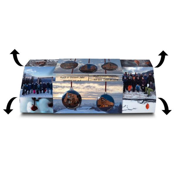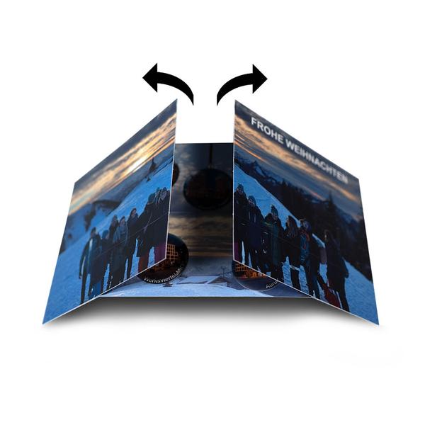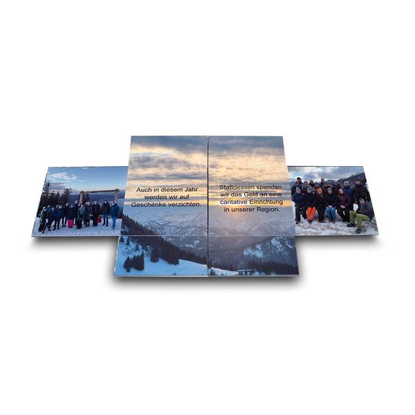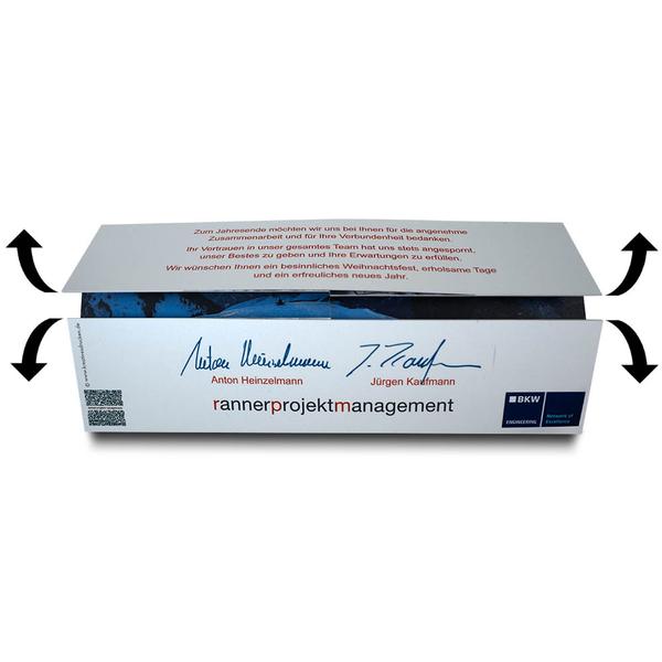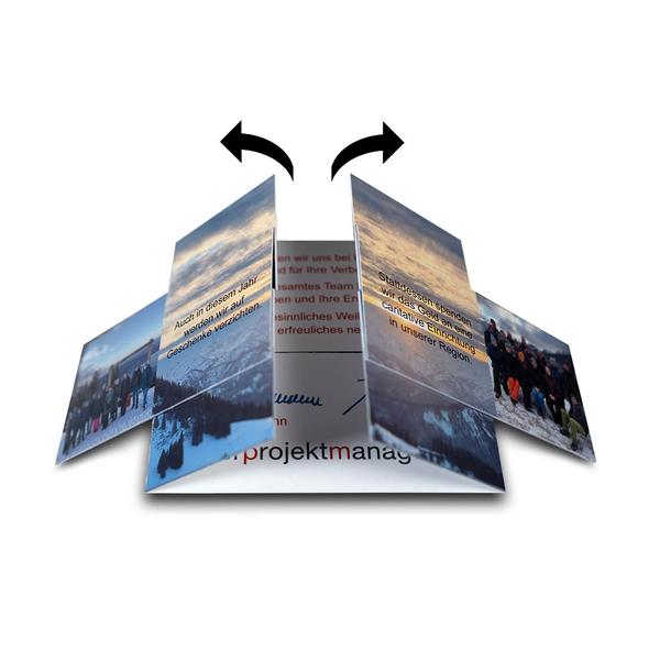 Die Endlosfalt-Weihnachtskarte fasziniert durch ihren spielerischen Faltmechanismus auf stabilem 400g White Design Karton, der durch eine edle matte Cellophanierung eine besonders hochwertige Haptik bietet. Beim Umfalten der anperforierten Seiten entstehen immer wieder neue Ansichten, die individuelle Bilder eines Betriebsausflugs in die Berge und ein herzliches Gruppenfoto effektvoll in Szene setzen. Die Ranner Projektmanagement GmbH nutzt dieses kreative Medium in der Projektsteuerung, um Mitarbeitern und Partnern für die vertrauensvolle Zusammenarbeit und Verbundenheit zu danken. Mit dieser interaktiven Drucksache erreicht das Unternehmen eine tiefe emotionale Bindung und weckt durch das ständige Entdecken neuer Botschaften die Neugier der Empfänger auf spielerische Weise. Wir unterstützen als Hersteller dabei, diesen wertschätzenden Markenkern in einem starken Markenauftritt haptisch perfekt zu präsentieren.