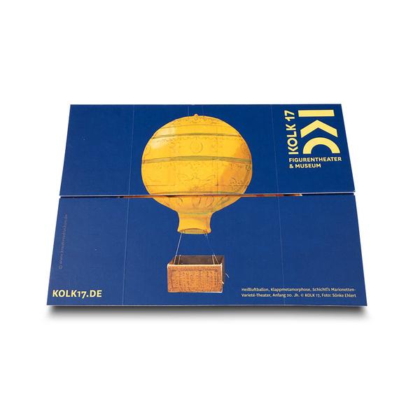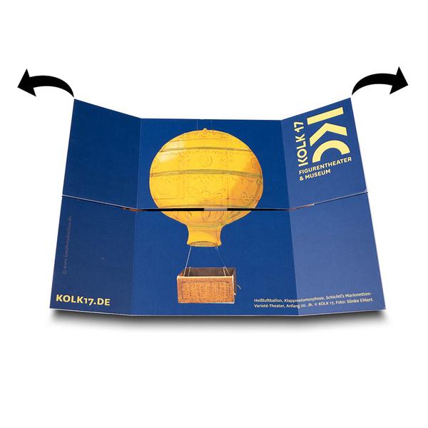 Die Endlosfaltkarte Figurentheater ist ein kreatives und vielseitiges Produkt für das Figurentheater-Museum Kolk 17. Dieser Magic Flyer ist ideal als Werbematerial, das die Neugier des Kunden weckt. Durch mehrmaliges Umfalten zeigt die Karte immer wieder eine neue Ansicht, beginnend mit einem Korb, der sich zu einem Heißluftballon entfaltet. Wir als Druckerei sind Experten für Effektkarten und individuelle Drucksachen. Wir wissen, wie man Markenbotschaften effektvoll erlebbar macht. Mit dieser hochwertigen Endlosfaltkarte helfen wir Kolk 17, den Markenkern professionell zu kommunizieren und Kunden zu begeistern. So wird jede Präsentation zum Highlight und die Kundenbindung im Kulturbereich optimal gestärkt.