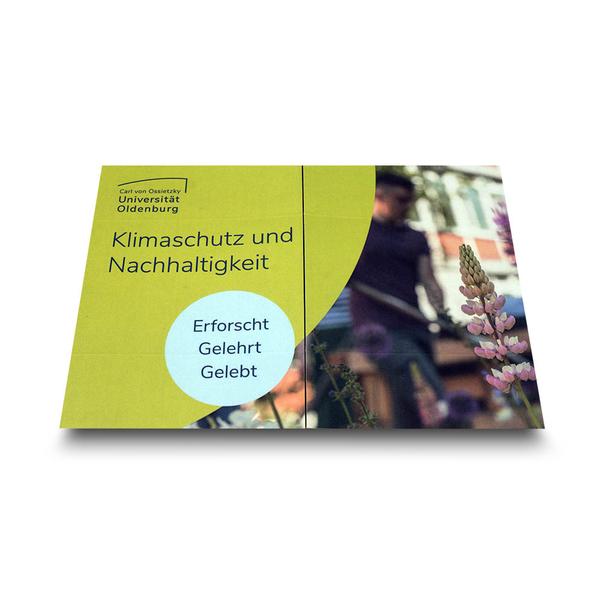 Die Endloskarte Klimaschutz Uni Oldenburg ist ein interaktives Magic-Flyer-Werbemittel mit raffinierter Faltmechanik und einseitiger matter Cellophanierung. Die in der Mitte perforierte Titelseite ermöglicht ein direktes Öffnen, danach werden Seitenflügel und Mittelteile Schritt für Schritt umgefaltet, sodass bei jeder Bewegung neue Ansichten entstehen. Auf allen Flächen vermitteln klar strukturierte Infotexte, Schaubilder und Motive Wissen rund um Nachhaltigkeit und Klimaschutz mit direktem Bezug zur Universität, ergänzt durch Logo und individuelles Design. Wir von Kreatives Drucken unterstützen die Carl von Ossietzky Universität Oldenburg dabei, ihre wissenschaftliche Kompetenz und ihr Engagement im Bildungssektor anschaulich und verständlich zu präsentieren. Die Endloskarte weckt Neugier, bleibt durch die interaktive Nutzung im Gedächtnis und macht Marken-Botschaften hochwertig erlebbar – auf Wunsch auch mit direkter Personalisierung.