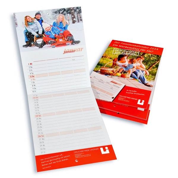 Der Familienkalender bzw. Streifenkalender ist ein praktisches und vielseitiges Produkt für Unternehmen jeder Branche. Dieser Kalender wird als Streifenkalender im A5-Format geheftet und aufgeklappt erreicht er ein Hochformat von 21 mal 42 Zentimetern. 13 freundliche Familienfotos machen Lust, den Alltag zu organisieren. Der Kalender kann individuell mit Ihrem Logo und durch Ihre Werbung angepasst werden. Wir als Druckerei sind Experten für Effektkarten, individuelle Drucksachen und Verpackungsdruck. Wir wissen, wie man Markenbotschaften effektiv erlebbar macht. Mit diesem hochwertigen Kalender helfen wir Ihnen, den Markenkern professionell zu kommunizieren und Kunden zu begeistern. So wird der Kalender zu einem nachhaltigen Werbeartikel und die Kundenbindung optimal gestärkt.