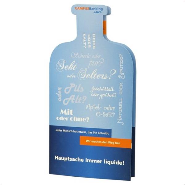 Auf den Innenseiten des Flaschenprospektes werden 3 Bank-Themen aufgegriffen, um das junge Publikum anzusprechen. Ein hochwertiger Karton, White Design in 300g mit beidseitger Li-Brillantlackierung, lässt haptisch keine Wünsche offen. Wir bringen auch Ihre 6-seitigen Prospekte in die gewünschte Form.