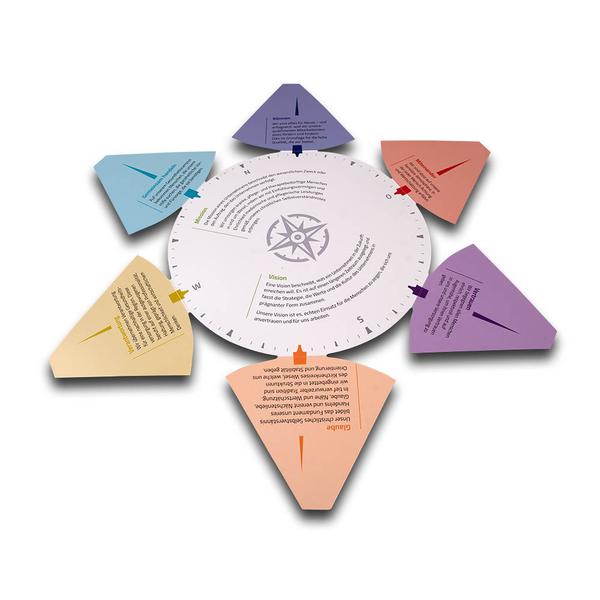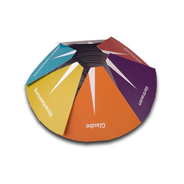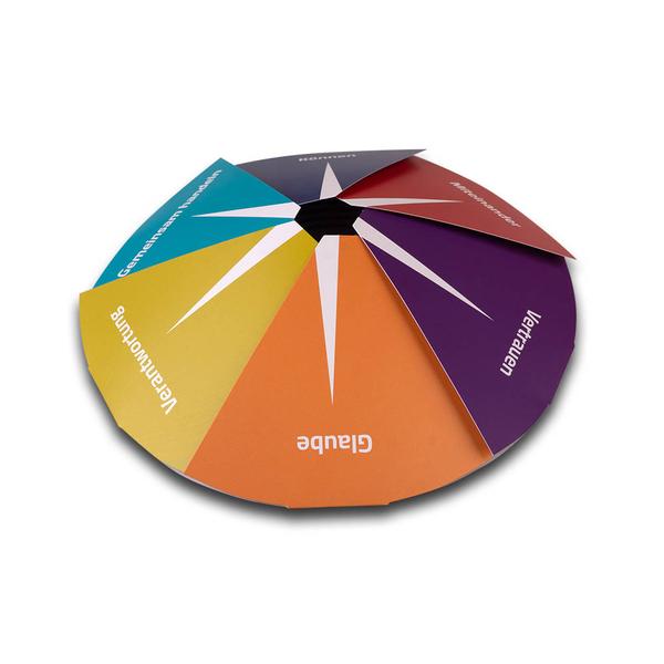 Die Klappkarte in Kompassform ist ein außergewöhnliches, kreisförmiges Printprodukt, unterteilt in sechs gleich große Segmente wie Tortenstücke. Jedes Element ist nach außen aufklappbar, beidseitig mit mattem Brillantlack veredelt und in einer eigenen Farbe gestaltet. Auf den Segmenten stehen die Werte „Glaube“, „Vertrauen“, „Verantwortung“, „Miteinander“, „Können“ und „gemeinsam handeln“ – beim Öffnen erscheint darunter ein Kompassmotiv sowie ein erläuternder Text auf der Rückseite jedes Elements. So entsteht ein interaktives Medium, das Inhalte Schritt für Schritt sichtbar macht und Orientierung symbolisch erlebbar gestaltet. Die Evangelisches Krankenhaus Wesel GmbH nutzt diese besondere Karte, um ihre Leitwerte und ihr medizinisches Leistungsverständnis anschaulich zu vermitteln. Als Hersteller begleiten wir die Umsetzung mit präziser Verarbeitung und unterstützen dabei, Werte und Kompetenz in einem starken Markenauftritt eindrucksvoll zu präsentieren.