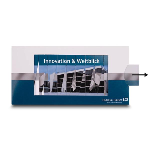 Die Lamellenkarte Einladung zur Einweihung ist ein kreatives Produkt für Unternehmen wie Endress. Diese Karte im DIN-lang-Format dient als Einladung zur Einweihung eines neuen Firmengebäudes und besticht durch die Lamellenfunktion. Durch Ziehen verändert sich das Motiv, die Schleife um das Gebäude öffnet sich, und der Titel wechselt von "Einladung zur Einweihung" zu "Innovation & Weitblick". Die Karte ist mit einem Gebäude der Firma bedruckt. Die Farben sind in Blau, Weiß und Grau gehalten. Diese hochwertige Karte hilft Endress, ihre Markenbotschaft professionell und kompetent zu kommunizieren. Ihre durchdachte Funktionalität und das ansprechende Design spiegeln den Qualitätsanspruch und die Seriosität des Unternehmens wider. Sie ermöglicht eine ansprechende Übergabe wichtiger Informationen an Kunden und Partner und stärkt so die Kundenbindung im Maschinenbau.