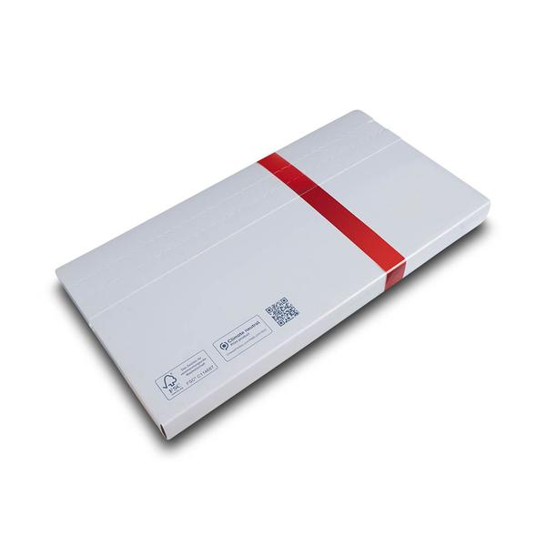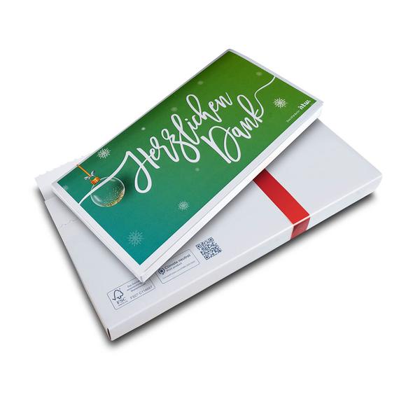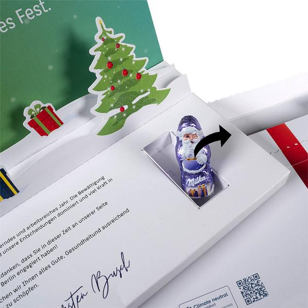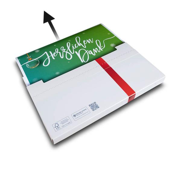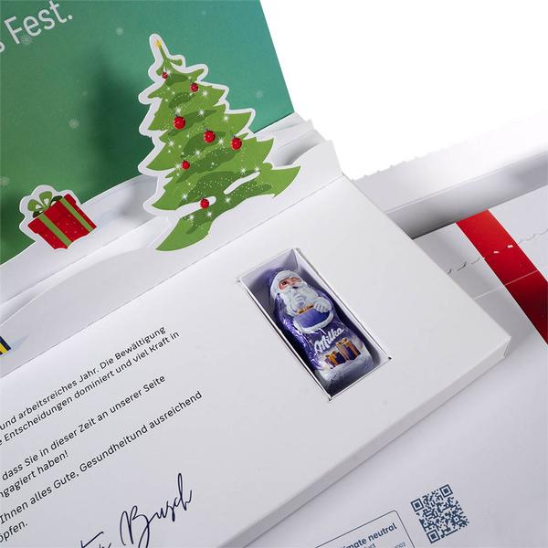 Die Mailing-Box ist hochwertig gestaltet und mit einem integrierten Aufreißverschluss versehen. Außen wirkt sie wie ein Geschenk: weiß gehalten, mit rotem Band und aufgedruckter Schleife, die sich sauber über den Aufreißstreifen öffnen lässt. Nach dem Öffnen erscheint eine innenliegende Pop-up-Karte, die beim Aufklappen eine mehrstufige Winterszene mit Weihnachtsbaum und Geschenken entfaltet. Im unteren Bereich befindet sich ein passgenaues Inlay für eine Weihnachts-Schokolade sowie eine Textfläche für persönliche Botschaften. Die Hochschule für Technik und Wirtschaft Berlin nutzt dieses besondere Weihnachtsmailing, um sich für die Unterstützung zu bedanken und gleichzeitig ein frohes Fest zu wünschen. Die Kombination aus Verpackung, 3D-Effekt und integriertem Produkt schafft einen emotionalen Überraschungsmoment und vermittelt Wertschätzung auf besondere Weise. Als Hersteller unterstützen wir dabei, solche individuellen Mailings präzise umzusetzen und Markenbotschaften wirkungsvoll in Szene zu setzen.