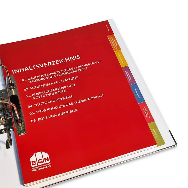Das Mieter-Register der Baugenossenschaft BGN Niederberg ist ein 7-fach Register mit Inhaltsverzeichnis auf der ersten Reistertabe. Das Register ist unterteilt in: Dauernutzungsvertrag, Mietvertrag, Hausordnung und Energieausweis. In der Rubrik 2 findet man die Mitgliedschaft und die Satzung. In der dritten Rubrik ist der Ansprechpartner und die Notrufnummer. Rubrik 4, 5 und 6 enthält nützliche Hinweise, Tipps rund ums Wohnen und Post von der BGN. Die Registertaben können wir nach Ihren Wünschen bedrucken, z.B. alphabetisch, mit Nummerierung oder einer individuellen Beschriftung. Selbstverständlich können Sie auch die einzelnen Trennblätter unterschiedlich farbig variieren. Zu den Registern stellen wir die passenden Ordner her.