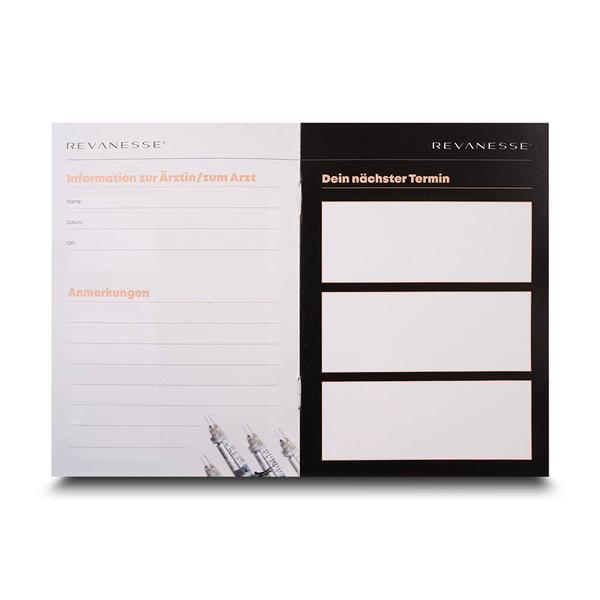 Der Patientenpass-Revanesse ist eine hochwertige Broschüre für die Beauty-Branche, wie das Beispiel von Revanesse zeigt. Die Broschüre ist geheftet mit einem Umschlag im A6-Format. Das Titelbild, das Gesicht eines Models, spiegelt die Beauty-Branche wider und vermittelt eine ansprechende Markenbotschaft. Die Innenseiten sind übersichtlich und schön gestaltet und bieten Platz für persönliche Patienteninformationen, bisherige Behandlungen, Anmerkungen und nächste Termine, was eine transparente Kommunikation mit dem Arzt ermöglicht. Diese hochwertige Broschüre hilft Revanesse, bei Kunden einen vertrauenswürdigen und kompetenten Eindruck zu hinterlassen. Ihre durchdachte Funktionalität und das ansprechende Design spiegeln den Qualitätsanspruch und die Seriosität des Unternehmens wider. Sie ermöglicht eine effiziente und repräsentative Übergabe von Informationen an Kunden und Partner und stärkt so die Kundenbindung im Beauty-Bereich.