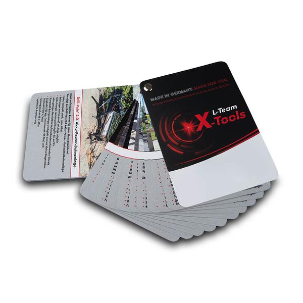 Der Produktfächer X-Tools Sommer-Event ist ein kreatives und vielseitiges Produkt für Unternehmen wie X-Tools Team. Der Produktfächer ist mit Bildern und Informationen bedruckt und dient als ideales Werbematerial, das durch seine Haptik und Struktur überzeugt. Verbunden ist der Fächer mit stabilen silbernen Buchschrauben und ist beidseitig mit matter Cellophanierung veredelt. Wir als Druckerei sind Experten für Effektkarten und individuelle Drucksachen. Wir wissen, wie man Markenbotschaften effektvoll erlebbar macht. Mit diesem hochwertigen Produktfächer helfen wir X-Tools Team, den Markenkern professionell zu kommunizieren und Kunden zu begeistern. So wird jede Produktpräsentation zum Highlight und die Kundenbindung optimal gestärkt.