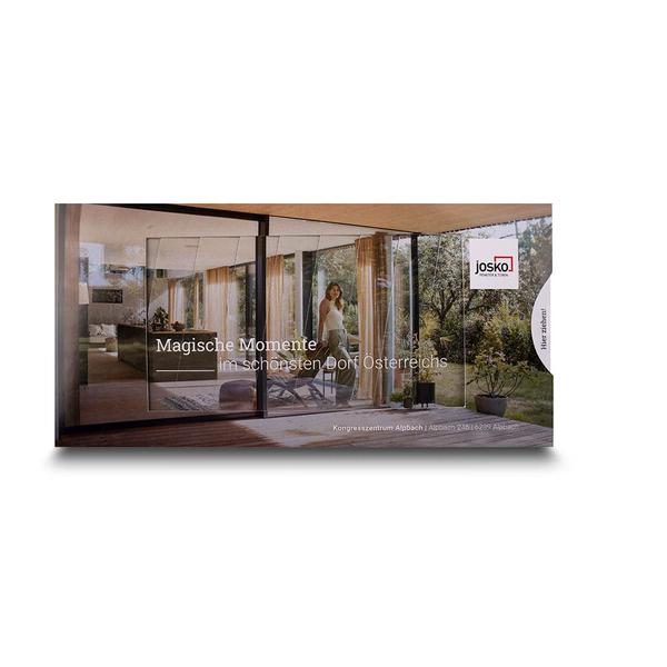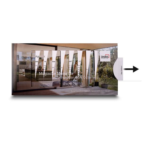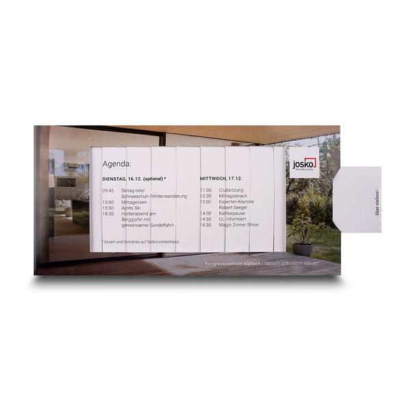 Die Save-the-date Einladung Lamellenkarte ist eine außergewöhnliche Effektkarte, die durch ihre raffinierte Schiebemechanik sofort Aufmerksamkeit erzeugt. Beim Ziehen an der seitlichen Lasche verschieben sich die Lamellen diagonal im Fensterausschnitt und geben Schritt für Schritt ein neues Motiv sowie die Einladungsinformationen frei. Dieser überraschende Bildwechsel macht die Einladung nicht nur visuell spannend, sondern auch haptisch erlebbar und sorgt für einen bleibenden Eindruck beim Betrachter. Als Hersteller unterstützen wir von Mappenhaus Josko dabei, ihre Innovationskraft und technische Kompetenz im Bereich Fenster und Türen wirkungsvoll zu präsentieren. Die interaktive Einladung transportiert den hohen Designanspruch und die Präzision der Marke und macht neugierig auf kommende Events und Produkte. So hilft die Lamellenkarte dabei, Marken-Botschaften hochwertig zu präsentieren, Emotionen zu wecken und Joskos Markenkern – Qualität, Technik und modernes Design – bereits beim ersten Kontakt erlebbar zu machen.
