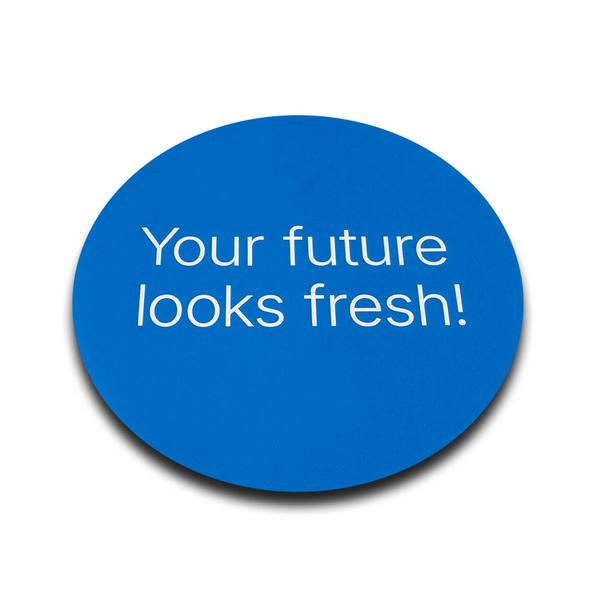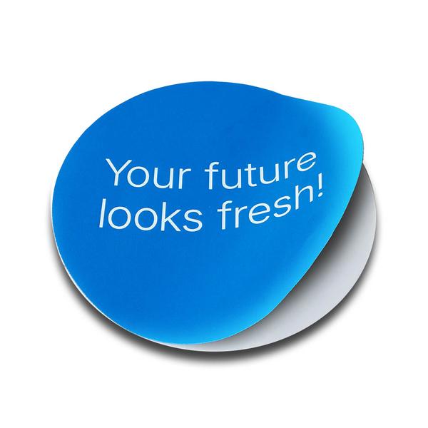 Die Sneaker Aufkleber sind runde, aufmerksamkeitsstarke Werbeträger aus hochwertigem 90 g Haftpapier mit matter Bilderdruckoberfläche und einem Durchmesser von 10 cm. Das leuchtend blaue Design mit der motivierenden Botschaft „Your future looks fresh!“ fällt sofort ins Auge und lässt sich dank permanent haftender, rückseitig geschlitzter Klebefläche besonders leicht anwenden. Entwickelt als modernes Give-away oder Promotionartikel eignen sich die Aufkleber ideal für trendige Oberflächen wie Sneaker, Laptops oder Verpackungen. Wir von Kreatives Drucken unterstützen die SCHOTT AG dabei, ihre Innovationskraft in der Hightech- und Glasindustrie durch diese individuell gestalteten Sticker sympathisch und zielgruppennah zu kommunizieren.