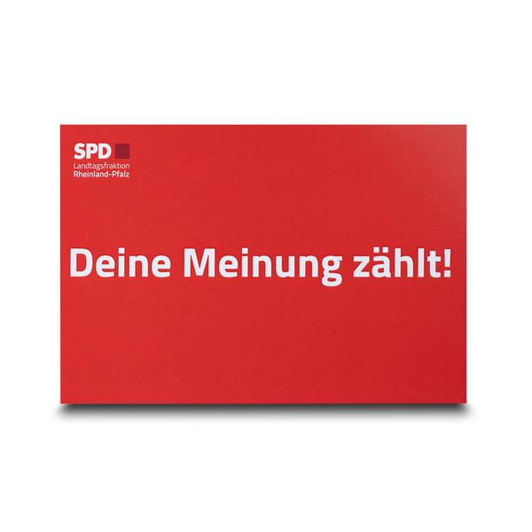 Die SPD Feedbackkarte ist ein effektives Produkt für politische Organisationen wie die SPD-Fraktion Rheinland-Pfalz, um den Dialog mit Bürgern zu fördern. Diese Postkarte im DIN A6-Format ist ganzflächig rot bedruckt und trägt auf der Vorderseite den Slogan „Ihre Meinung zählt“, was zur aktiven Beteiligung anregt. Auf der Rückseite befindet sich ein großes, weißes Schreibfeld für Anliegen, Wünsche und Ideen zu landespolitischen Themen. Diese hochwertige Drucksache hilft der SPD-Fraktion, eine bürgernahe und offene Markenbotschaft zu kommunizieren. Ihre durchdachte Funktionalität und das ansprechende Design spiegeln den Qualitätsanspruch und die Seriosität der Organisation wider. Sie ermöglicht eine effiziente und repräsentative Übergabe von Informationen an die Bürger und stärkt so das Vertrauen und die Bindung an die politische Arbeit.