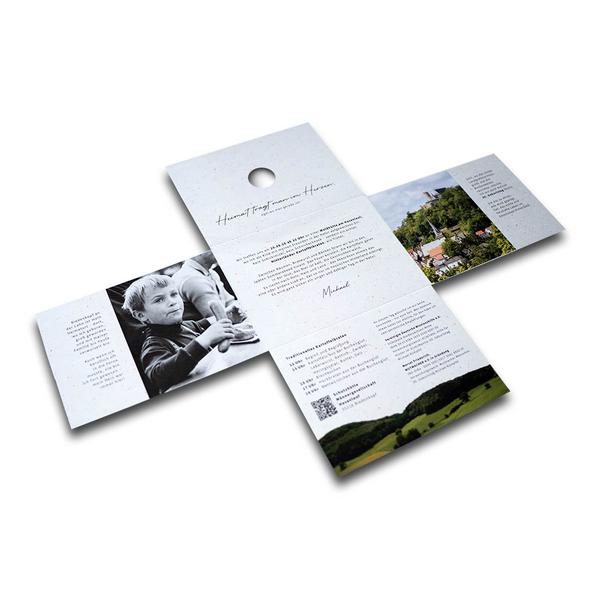 Der Sternfolder Einladung Kartoffelbraten fasziniert durch einen interaktiven Kreuz-Mechanismus, der sich aus einem handlichen DIN A6 Format schrittweise zu einer großflächigen Einladung mit QR-Codes und stimmungsvollen Bildmotiven entfaltet. Die Rainer Herrmann GmbH nutzt dieses originelle Werbemittel im Bereich der regionalen Dienstleistungen, um Kunden und Partner zum traditionellen Kartoffelbraten einzuladen und die Botschaft „Heimat bleibt“ haptisch zu untermauern. Das Unternehmen erreicht mit dieser besonderen Falttechnik eine überdurchschnittliche Aufmerksamkeit und vermittelt alle wichtigen Event-Informationen in einer logisch aufgebauten, spannenden Reihenfolge. Durch die hochwertige Haptik stärkt der Kunde die Vorfreude auf die Veranstaltung und festigt seine Position als nahbarer, kompetenter Partner. Wir unterstützen als Hersteller dabei, diesen authentischen Markenkern in einem starken Markenauftritt perfekt zu präsentieren.