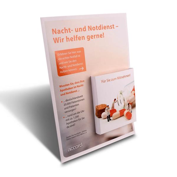 Der Thekenaufsteller-Apotheken-Notdienst ist eine praktische Kombination aus Werbefläche und Informationsquelle für Ihre Kunden. Auf der bedruckten Vorderseite bietet er Raum für Ihre Apothekenwerbung, während eine integrierte Tasche Platz für L-DIN Prospekte bereithält, die über den aktuellen Apothekennotdienst informieren. Die Rückseite des Aufstellers dient als stabiler Fuß für eine optimale Platzierung auf Ihrem Tresen. So können Apotheken ihren Kunden auf einen Blick wichtige Notdienstinformationen zugänglich machen und gleichzeitig ihre eigenen Angebote präsentieren. Wir als Ihr Druckpartner unterstützen Sie dabei, diesen wichtigen Service ansprechend und professionell zu kommunizieren. Dieser Thekenaufsteller ist eine wertvolle Ergänzung für jede Apotheke.
