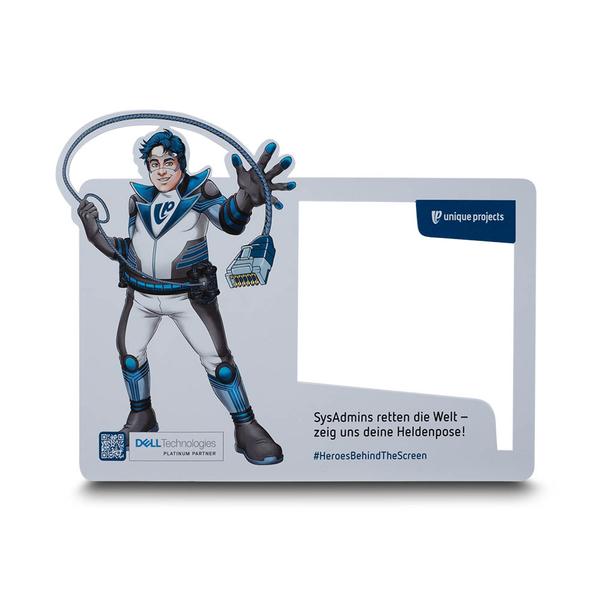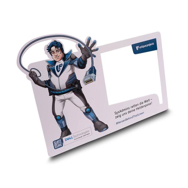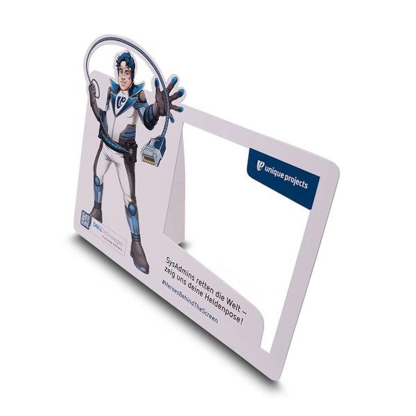 Der Thekenaufsteller mit Konturstanzung unique projects ist ein kreatives und aufmerksamkeitsstarkes Produkt für Agenturen wie Unique Projects. Dieser Aufsteller ist mit einem humorvollen, werblichen Slogan bedruckt und als IT-Superheld konturgestanzt. Das vollflächig kaschierte Produkt dient als wirksame analoge Werbung und ist ideal, um die Markenbotschaft mit einem Augenzwinkern zu vermitteln. Wir als Druckerei sind Experten für Effektkarten und individuelle Drucksachen. Wir wissen, wie man Markenbotschaften effektvoll erlebbar macht. Mit diesem hochwertigen Thekenaufsteller helfen wir Unique Projects, sich von der Konkurrenz abzuheben und die Kundenbindung im Marketing- und Kommunikationsbereich zu stärken.