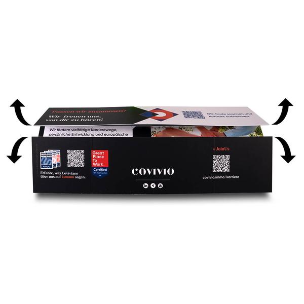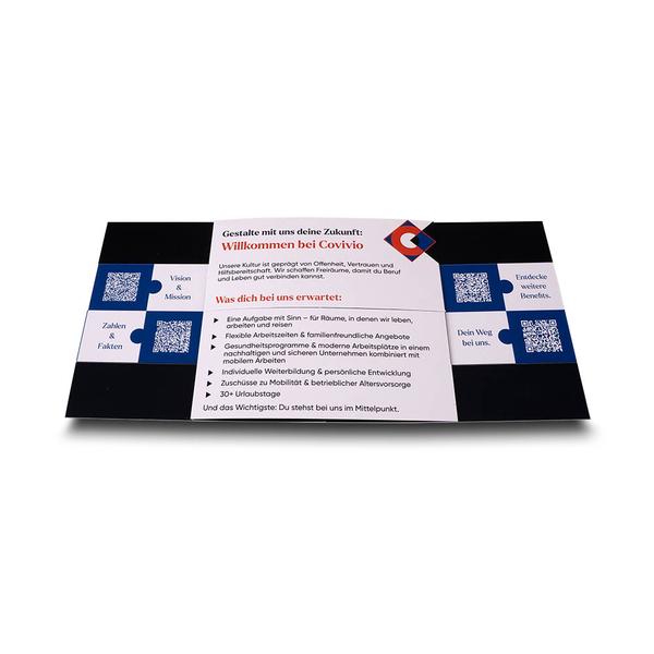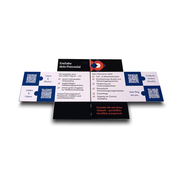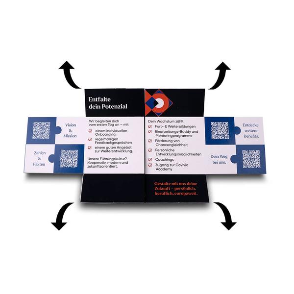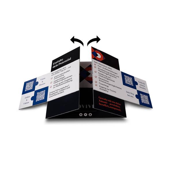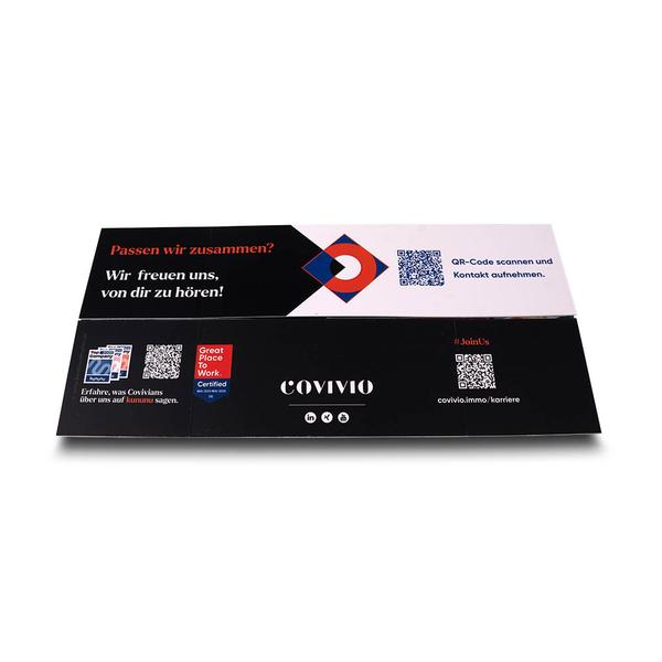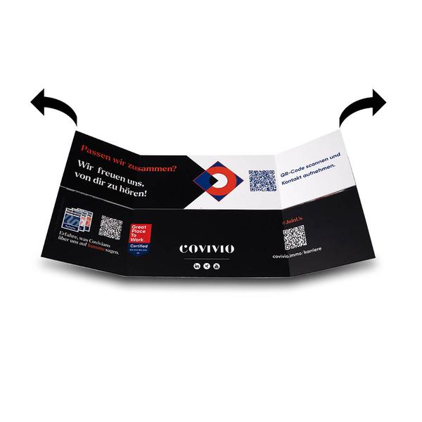 Die Unendlichkeitskarte Immobilien ist ein aufmerksamkeitsstarkes Präsentationsmedium, das durch seine besondere Falttechnik sofort fasziniert. Die mittig anperforierte Titelseite öffnet sich direkt, Seitenflügel und Mittelteile werden nacheinander umgeschlagen und bei jeder Bewegung entsteht eine neue Ansicht – ein interaktiver Magic Flyer, der Inhalte Schritt für Schritt erlebbar macht. Gedruckt auf 360 g White Design, beidseitig veredelt mit matter Cellophanierung und individuell mit Bildern, Texten sowie QR-Codes gestaltet, entsteht eine kompakte, hochwertige Unternehmenspräsentation. Die Karte bleibt an definierten Haltepunkten verbunden und ermöglicht eine direkte Personalisierung für gezielte Kundenansprache. Die Covivio Immobilien GmbH setzt diese besondere Faltkarte ein, um Projekte, Standorte und Serviceleistungen lebendig und übersichtlich zu präsentieren. Mit jedem Umklappen wächst das Interesse des Betrachters, Informationen werden strukturiert aufgebaut und die Marke bleibt nachhaltig im Gedächtnis. Als Hersteller unterstützen wir Covivio dabei, ihre Kompetenz in einem hochwertigen Markenauftritt sichtbar zu machen und Kundengewinnung kreativ und wirkungsvoll zu stärken.