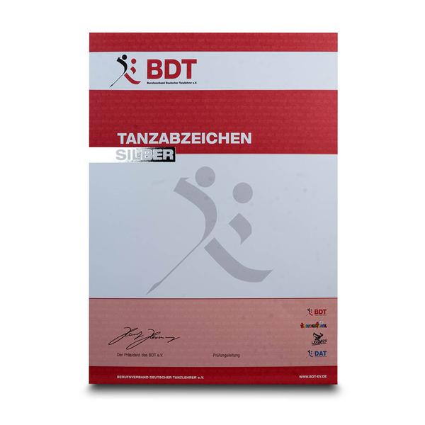 Die Urkunde Tanzabzeichen Silber ist eine hochwertige Auszeichnung auf 160 g Natureline Clair, FSC-zertifiziert, mit sportlich-klarem Design in Rot und Weiß. Das Logo BDT sowie der Titel „Tanzabzeichen Silber“ sind präzise platziert, ergänzt durch Unterschrift und Kooperationshinweise. Der Rahmen um das Wort „Silber“ ist mit einer silbernen Heißfolienprägung veredelt, wodurch sich die weiße Schrift edel und wirkungsvoll abhebt. So entsteht eine Urkunde, die Leistung sichtbar würdigt und einen bleibenden Eindruck hinterlässt. Der BDT nutzt diese Auszeichnung im Tanz- und Sportbereich, um erfolgreiche Prüfungen offiziell zu bestätigen und besondere Leistungen feierlich zu überreichen. Die hochwertige Gestaltung unterstreicht den Wert des erreichten Abzeichens und stärkt die Motivation der Teilnehmenden. Als Hersteller begleiten wir die Umsetzung und sorgen dafür, dass jede Ehrung in einem starken Markenauftritt professionell und hochwertig präsentiert wird.