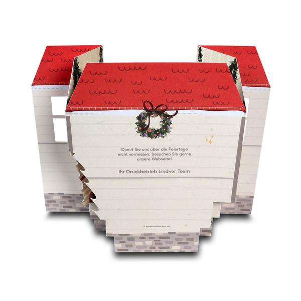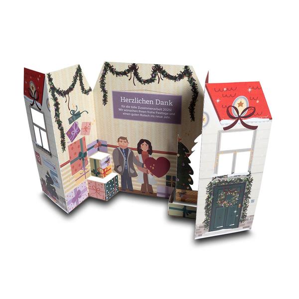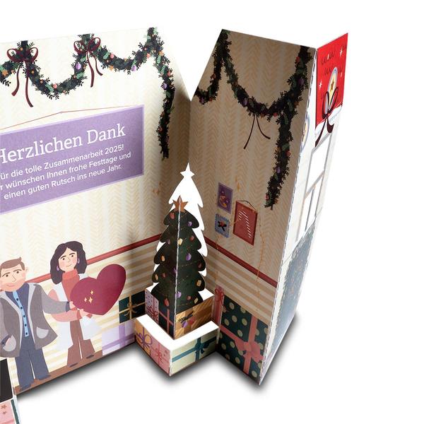 Die Weihnachtskarte Altarfalz ist aus hochwertigem 300 g Natureline Premium gefertigt und als aufklappbares Haus gestaltet, das bereits geschlossen Neugier weckt. Beim Auseinanderziehen der Seiten öffnet sich der Innenraum und ein detailreich gestalteter 3D-Weihnachtsbaum richtet sich eindrucksvoll auf – ein überraschender Moment mit starker haptischer Wirkung. kreatives drucken nutzt diese interaktive Karte, um Dankbarkeit stilvoll zu vermitteln und mit einem integrierten Web-Hinweis gezielt auf das eigene Online-Angebot aufmerksam zu machen. Die Kombination aus Bewegung, Design und Botschaft schafft eine nachhaltige Erinnerung und positioniert die Marke kreativ und aufmerksamkeitsstark. Als Hersteller unterstützen wir dabei, diese Idee präzise umzusetzen und in einem starken Markenauftritt hochwertig sichtbar zu machen.